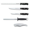 3 knives + sharpening steel + ham tongs